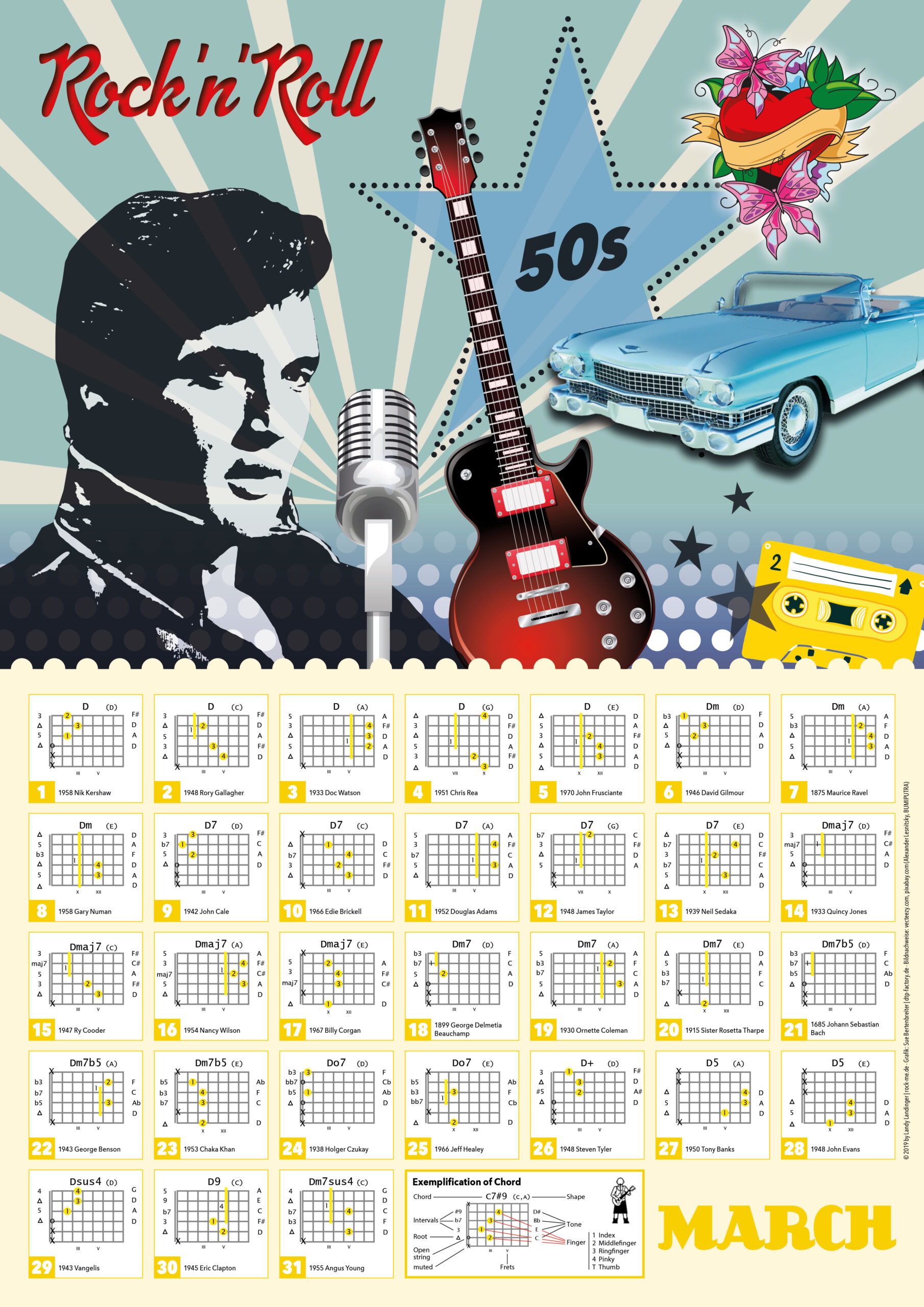 Darüber hinaus enthält der Kalender 12 farbige Collagen zu einem Gitarrenstil der Musikgeschichte und verzeichnet 365 Geburtstage berühmter Gitarrenspieler und Komponisten. So erlaubt er monatlich einen Ausflug in die Geschichte des Gitarrenspiels und der Musik.